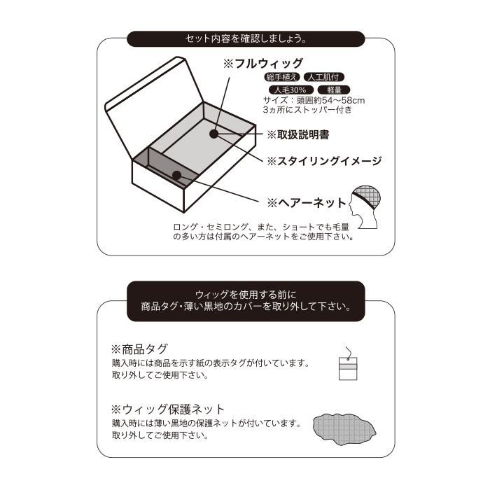 ・セット商品:フルウィッグ、ヘアネット 、取扱い説明書、スタイリングイメージ書